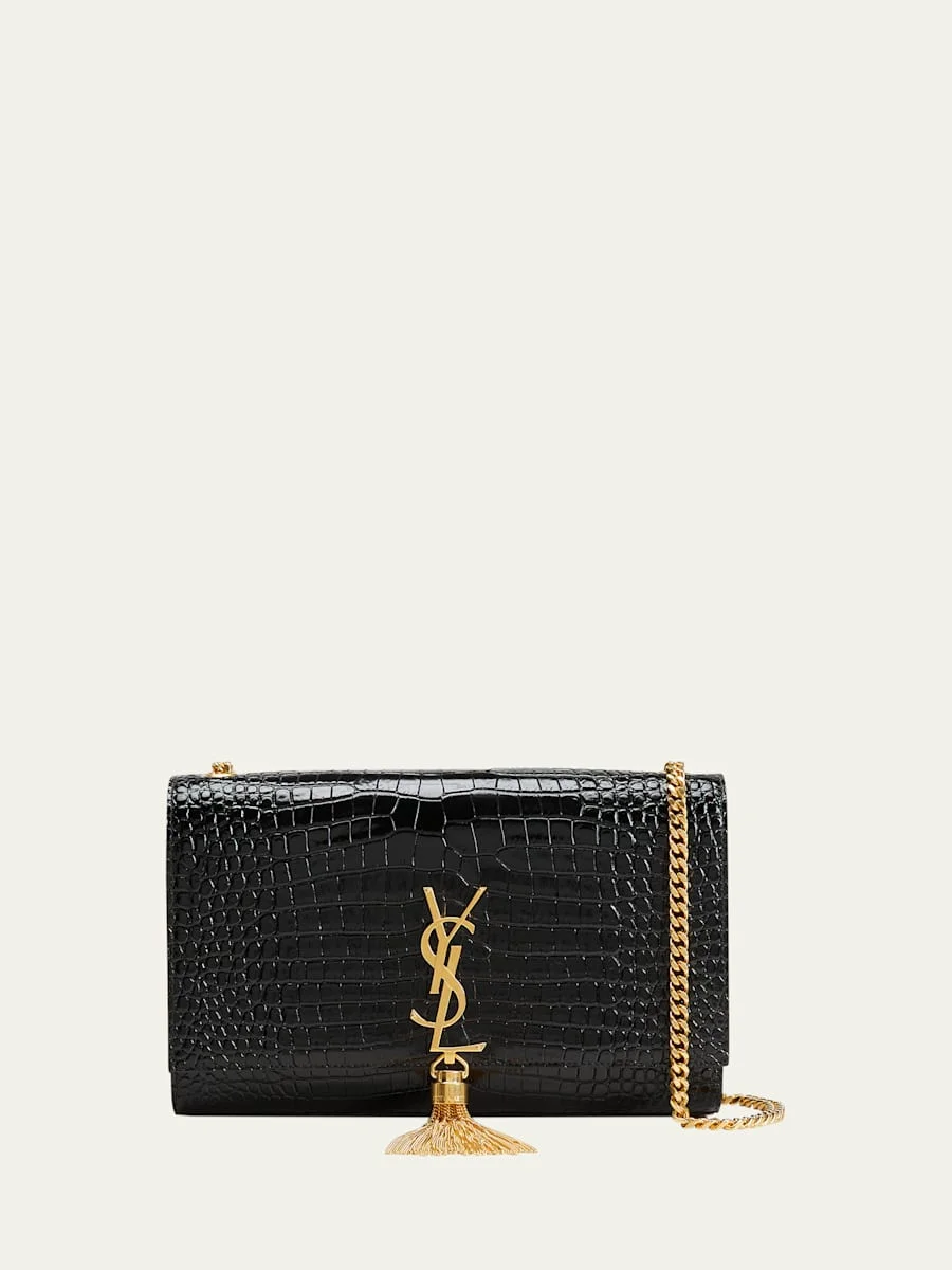 Saint Laurent crocodile-embossed leather shoulder bag with golden hardware. Chain shoulder strap pulls through top, 19" drop. Strap can be worn single or doubled. Full flap top with metal YSL logo and tassel. Hidden snap closure. Interior, grosgrain lining; one slip pocket. 5.7"H x 9.4"W x 2.1"D. "Kate Monogram" is made in Italy. Online Inquiries: BGS21_L6HXA| Store Inquiries: #2043818