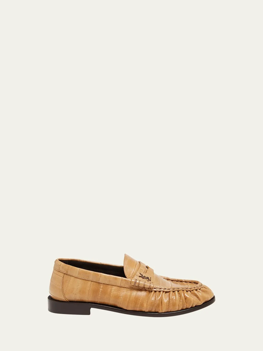 Finished with signature Cassandre gold-tone hardware, the "Le Loafers" by Saint Laurent are made of supple eel leather Stacked flat heel Hand-stitched round moc toe Notched vamp with keeper strap Slip-on style Lining: Unlined Made in Italy Size Note: Saint Laurent shoes run small. Please order a 1/2 size larger than you typically wear. Online Inquiries: BGS21_X7CZH| Store Inquiries: #5433228
