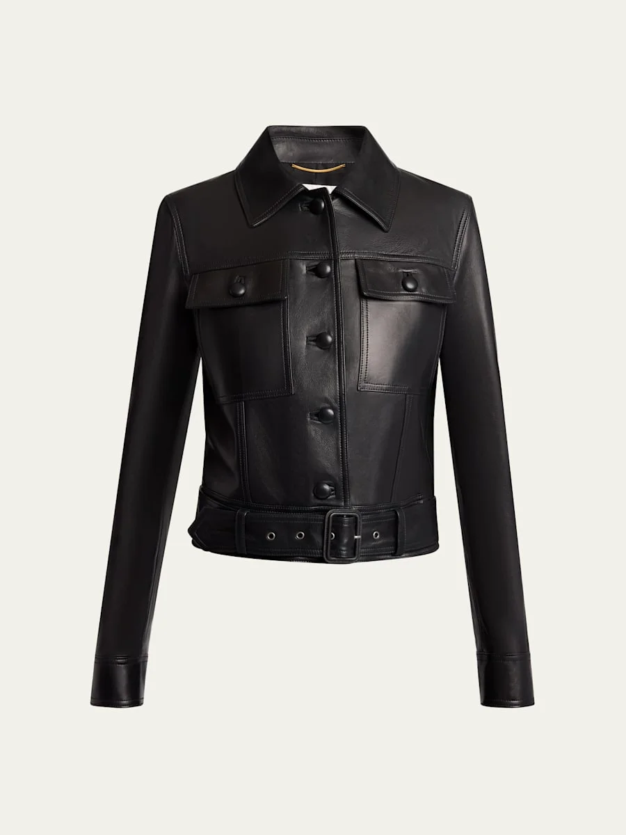 Saint Laurent lambskin leather jacket featuring a belted hem Spread collar; button front Adjustable buckle strap at hem Long sleeves; button on cuff Two front flap pockets Straight fit Hip length Made in Italy Proposition 65 warning for California residents Online Inquiries: BGS21_B9PAP| Store Inquiries: #4934477