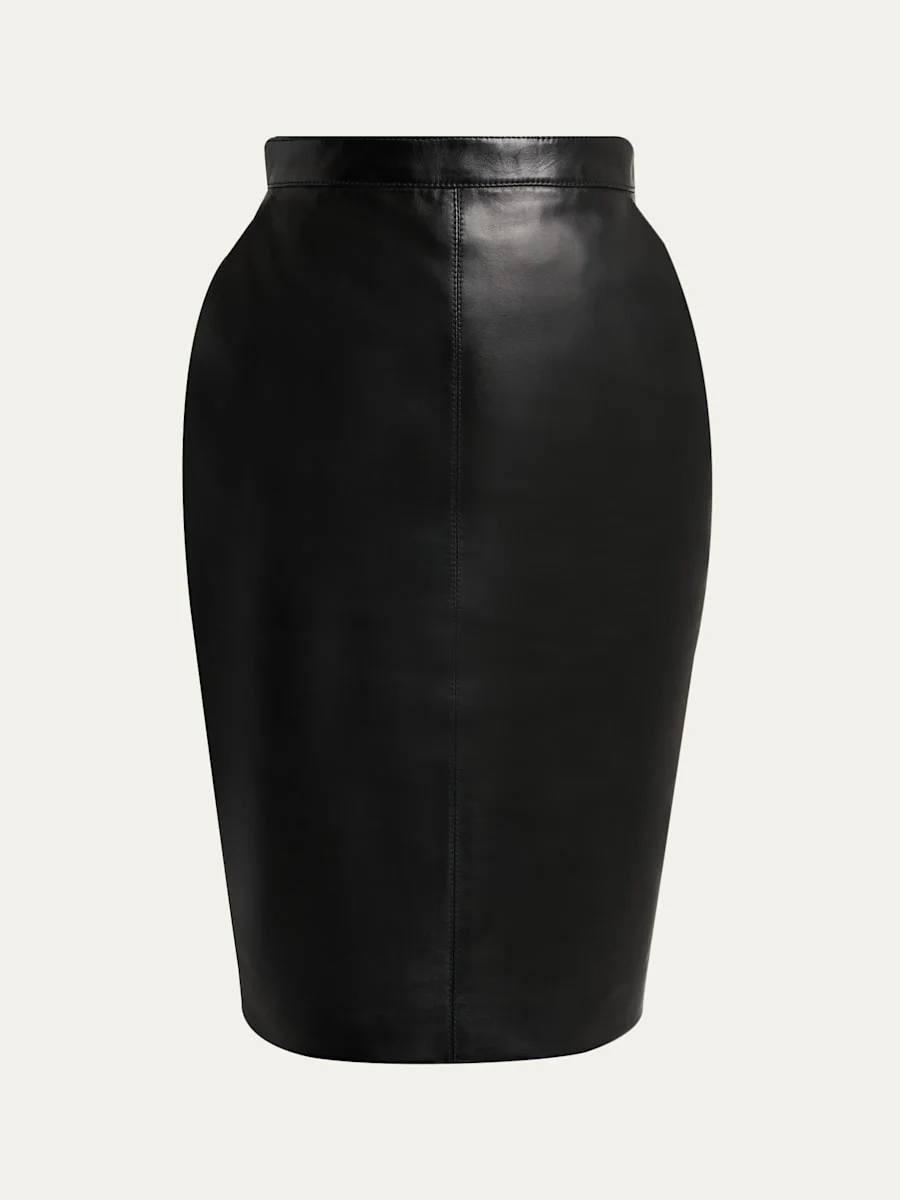 Saint Laurent pencil skirt is crafted of a supple lambskin leather High waist Angled side slip pockets Knee length Pencil silhouette Walking vent back Invisible back zip Leather/silk Made in Italy Online Inquiries: BGS21_BB14R| Store Inquiries: #5434015