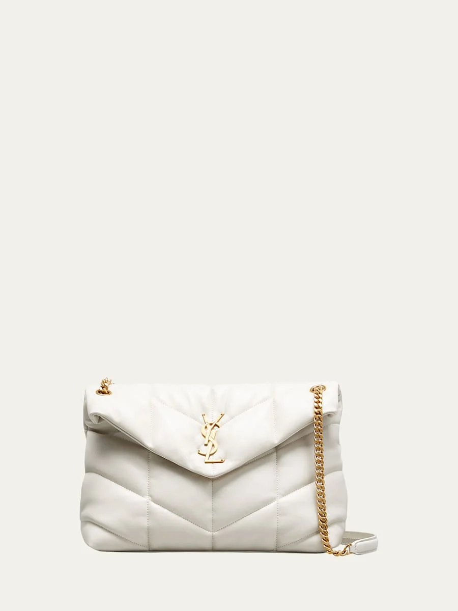 Saint Laurent monogram shoulder bag in puffy quilted lamb leather, with metal YSL logo Gold-tone, silver-tone, or black hardware. Sliding suede and chain crossbody strap may be doubled for shoulder carry, 11-18.9" drop. Can be worn on the shoulder or across the body. Envelope flap with snap closure. Interior, suede lining; one zip pocket. 9.1"H x 13.8"W x 5.3"D. Approx. weight 1.9 lb. "Loulou" is made in Italy. Online Inquiries: BGS21_V4XSN| Store Inquiries: #3572977