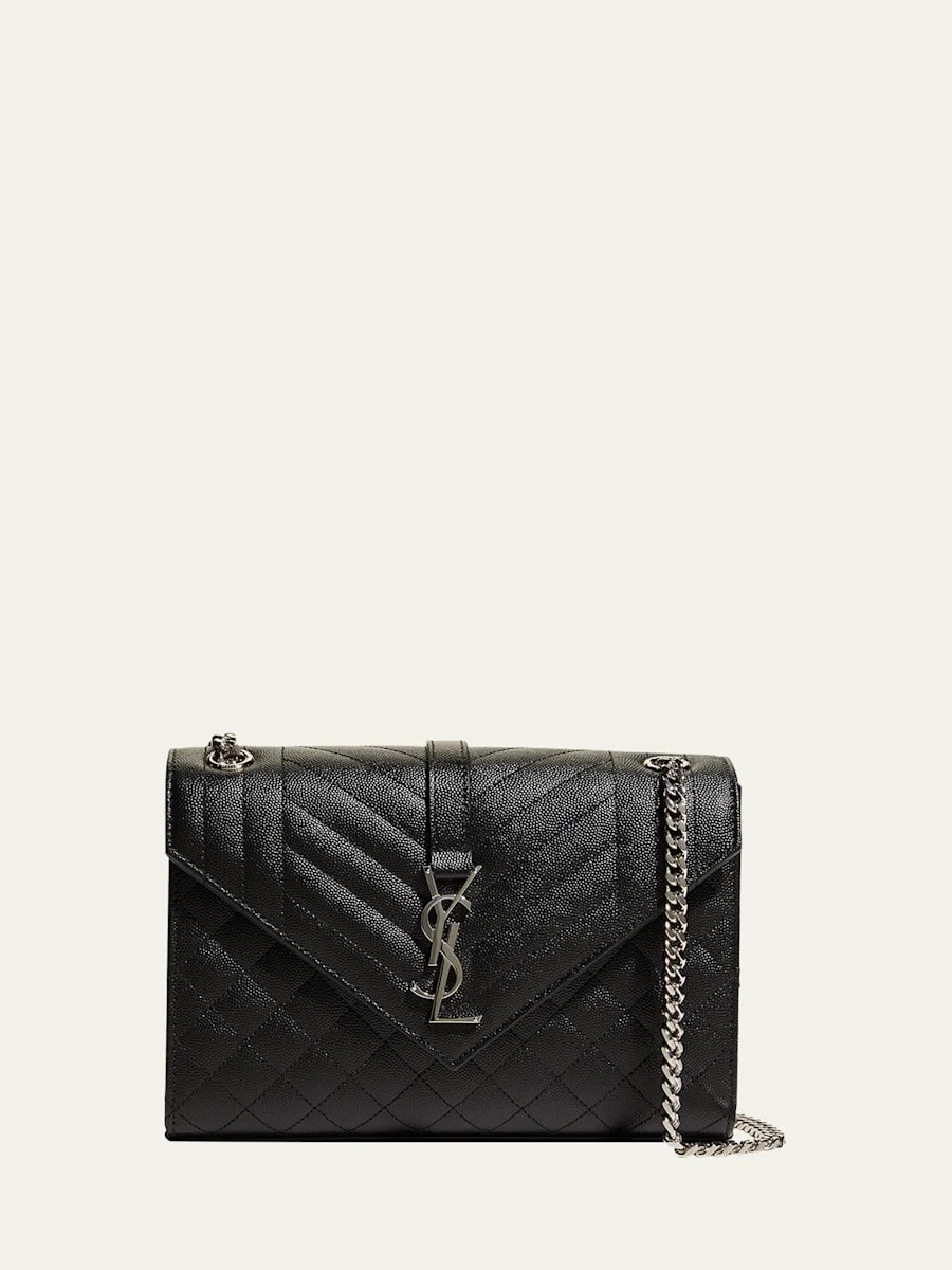 Saint Laurent shoulder bag in chevron- and diamond-quilted grain leather. Chain and leather shoulder straps, 10.4" drop. Envelope flap with YSL logo; snap closure. Interior features pockets. 6.9"H x 9.5"W x 2.4"D. Approx. weight 2.9 lb./ 1.3 kg. Made in Italy. Online Inquiries: BGS21_V5JW0| Store Inquiries: #2402980