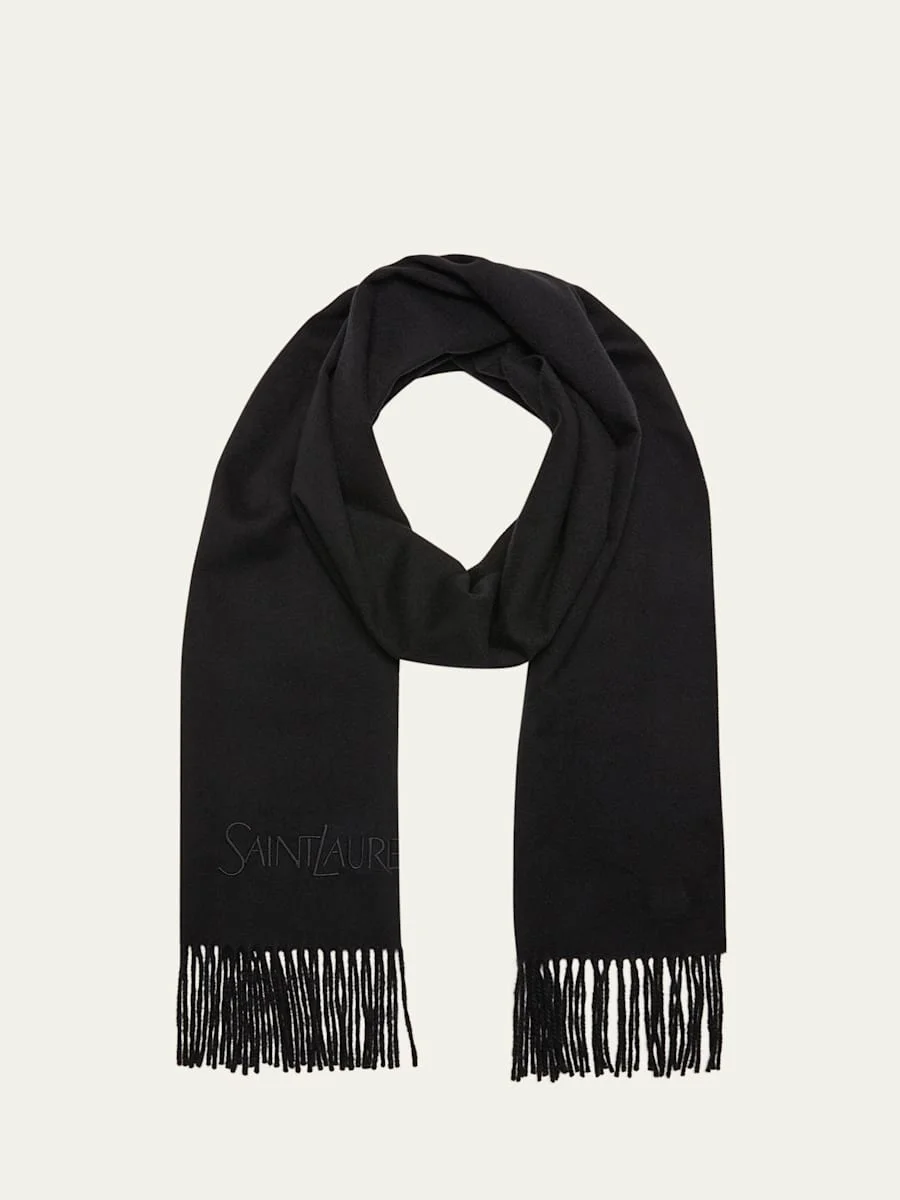 Saint Laurent solid scarf in cashmere features tonal embroidered logo lettering at the end Approx. 70.86"L x 13.8"W Fringe ends May be styled multiple ways Cashmere Made in Italy Online Inquiries: BGS21_NBC2B| Store Inquiries: #4622820