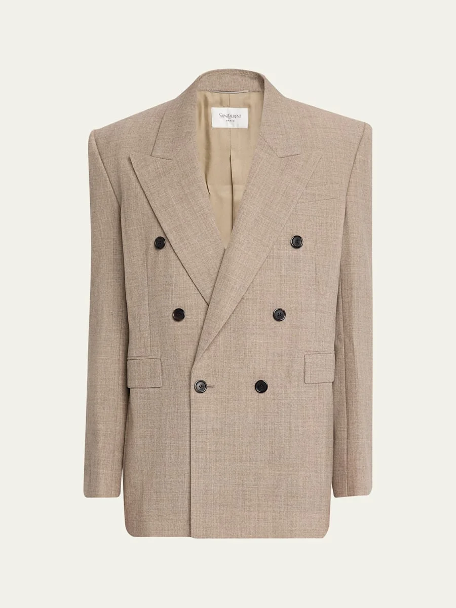 Saint Laurent blazer jacket in wool Peak lapels; double-breasted front Long sleeves Unfinished cuffs Chest welt pocket Hip flap pockets Tailored fit Double walking vent Button closure Wool Made in Italy Online Inquiries: BGS21_NDQM0| Store Inquiries: #5067458