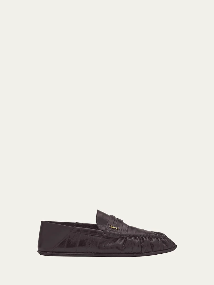 Saint Laurent "LE" penny loafers in eel skin leather Features a flexible heel counter that can be worn up or folded down 0.75 in / 20 mm flat heel Round moc toe Penny keeper strap with Cassandre hardware Leather outsole Slip-on style Made in Italy Online Inquiries: BGS21_NCCGR| Store Inquiries: #4855394
