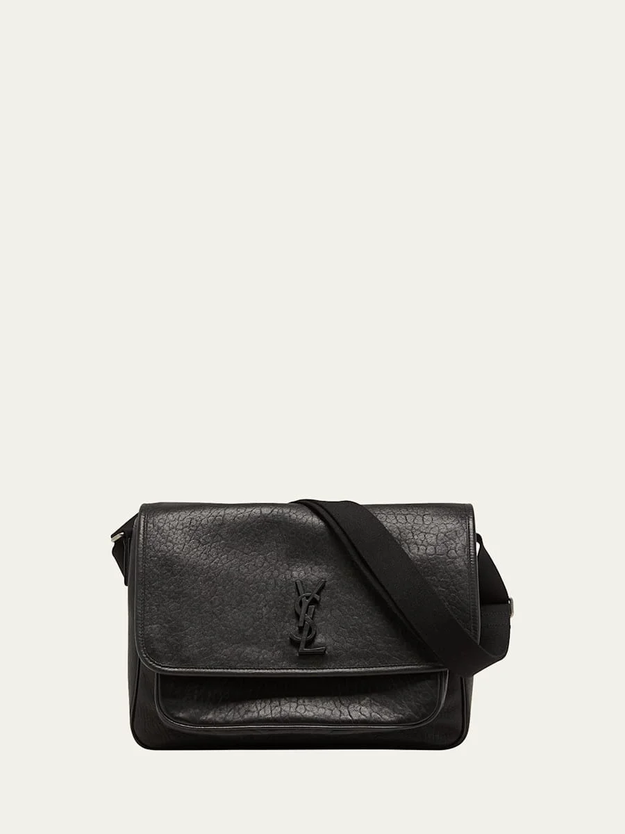 Saint Laurent "Niki" messenger bag in graned leather with tonal matte Cassandre hardware Adjustable webbing shoulder strap; approx. 12.9-27.5"L Flap top with magnetic snap closure Exterior, one back slip pocket Interior, two main compartments, one zip pocket Approx. 9"H x 12.7"W x 3.9"D Made in Italy Proposition 65 warning for California residents Online Inquiries: BGS21_NBV6N| Store Inquiries: #4725119