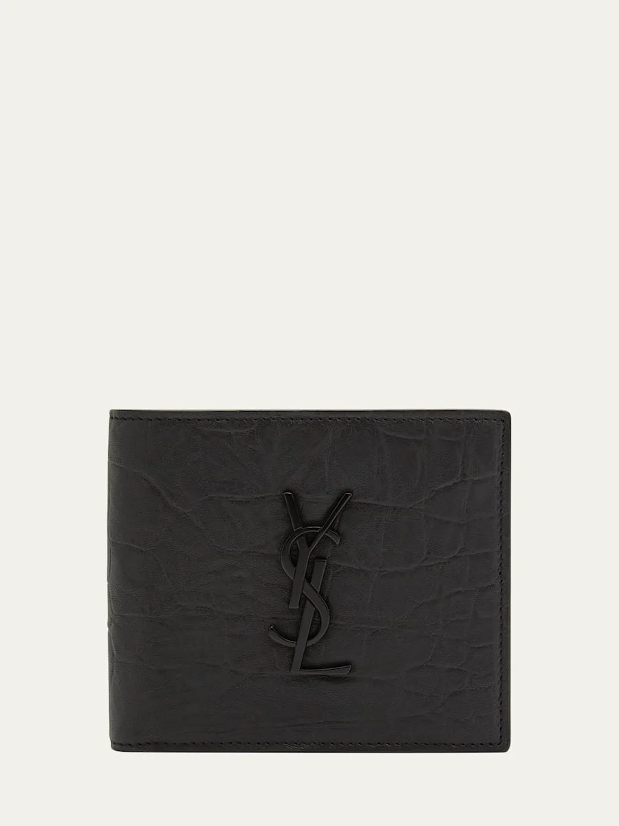 Saint Laurent bifold wallet in textured matte leather features tonal matte monogram plaque at front Approx. 4.3"L x 3.5"W Eight interior card slots; two side slip pockets Two interior note compartments Leather Wipe clean Made in Italy