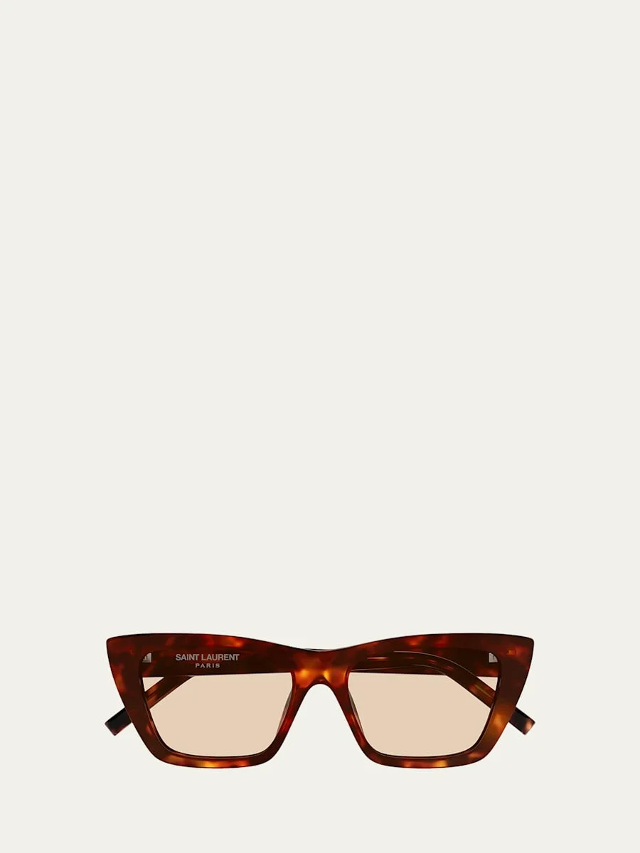 The "Mica" acetate sunglasses by Saint Laurent flaunt a chic street look. Lens/bridge/temple (in mm): 5316145 Angular cateye frames Solid lenses Fixed nose pads Thin, tapered arms Includes case and cleaning cloth 100% UVA/UVB protection Made in Italy