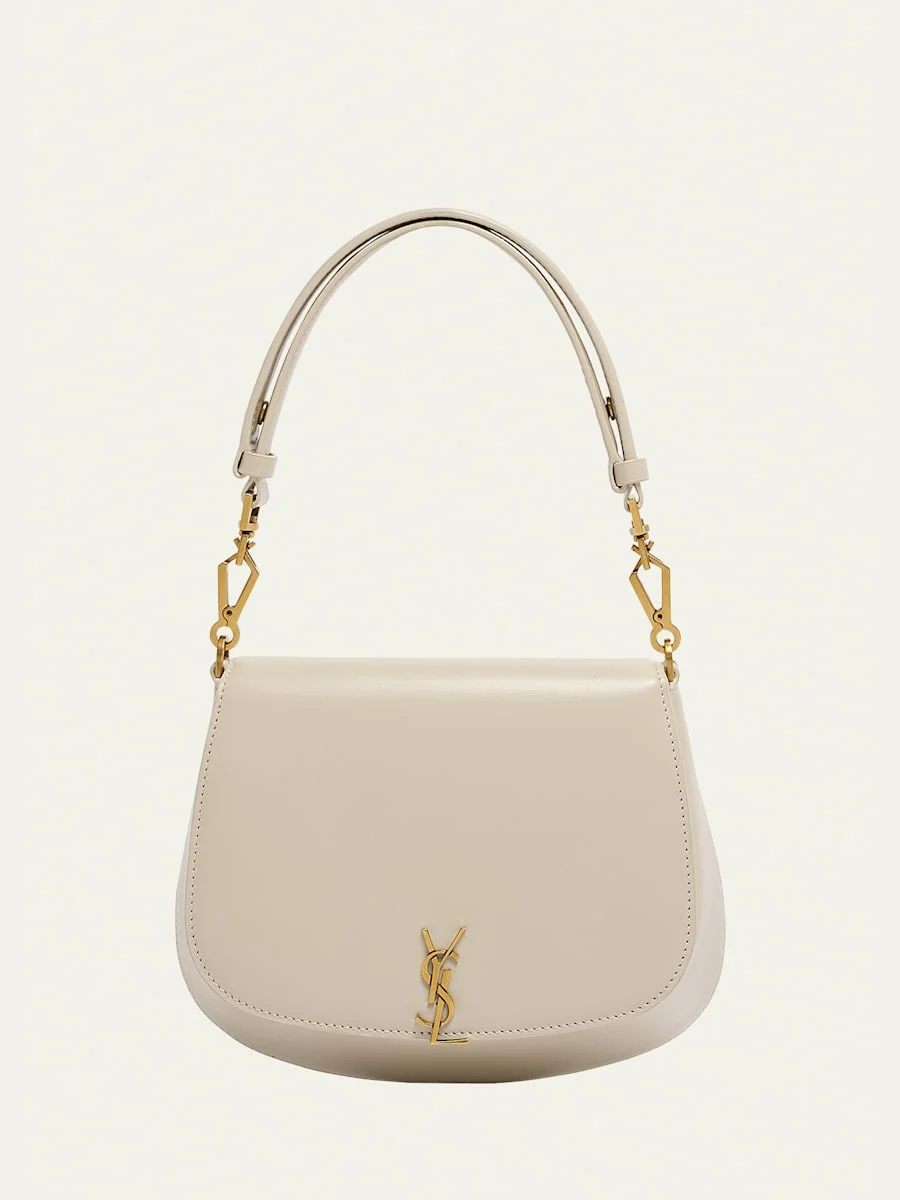 Saint Laurent top handle bag in calfskin leather Detachable, adjustable top handle Flap top with magnetic closure; YSL logo lettering Interior, one slip pocket Golden hardware Approx. 6.9"H x 8.3"W x 3.1"D Professional cleaning recommended Made in Italy Proposition 65 warning for California residents Online Inquiries: BGS21_V6AF3| Store Inquiries: #4855321