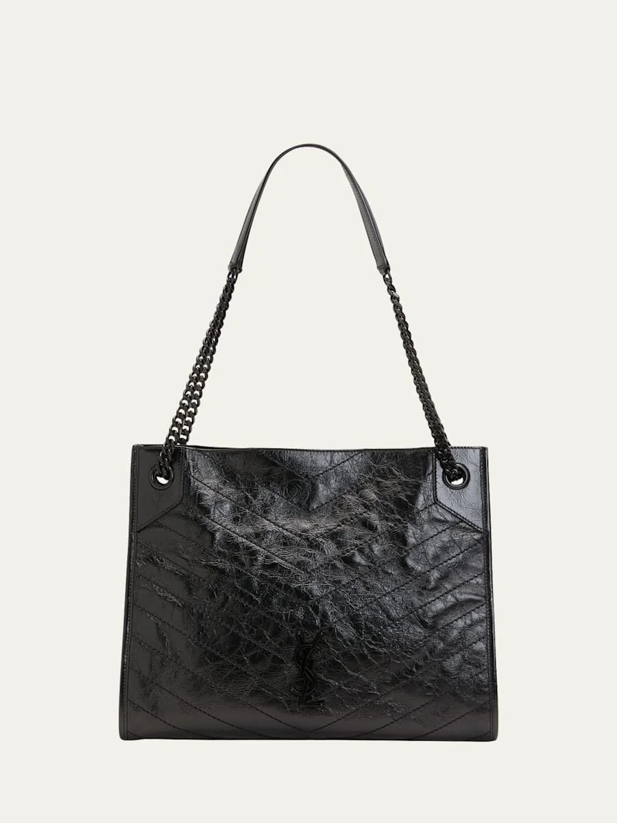 Some say that a woman's bag is a bottomless pit but they're just jealous that you can fit all your belongings (and more!) into this Niki tote from Saint Laurent. Once again, you've got it in the bag. Featuring top handles, a quilted effect, an internal zipped pocket, an internal logo patch, silver-tone hardware and a tonal YSL logo applique on the front. Saint Laurent crinkled calf leather tote bag in subtle Y stitching. Chain and flat shoulder straps. Adjustable chain strap with 19" drop Open top with snap closure. Signature YSL blackened hardware at center. Interior, one zip pocket. Dimensions: 10"H x 12.75"W x 4"D Presented with a Saint Laurent dust bag. "Niki" is made in Italy. Online Inquiries: BGS21_V4UYW| Store Inquiries: #3686438