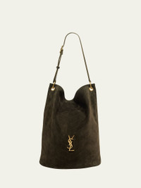 Saint Laurent supple bucket bag in suede decorated with chevron-quilted topstitching Features signature YSL logo Adjustable shoulder strap, 12.8" drop Open top with magnetic closure Interior, attached zip-top pouch Approx. 26.8"H x 16.9"W x 8.7"D Made in Italy Online Inquiries: BGS21_V6MMA| Store Inquiries: #5061407