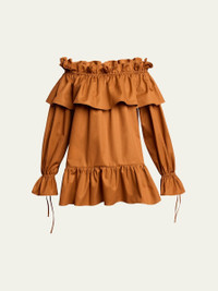 Saint Laurent ruffled dress Off-the-shoulder neckline Long sleeves; drawstring cuffs Mini length Shift silhouette Cotton Made in France Proposition 65 warning for California residents Online Inquiries: BGS21_B9PBB| Store Inquiries: #4934508