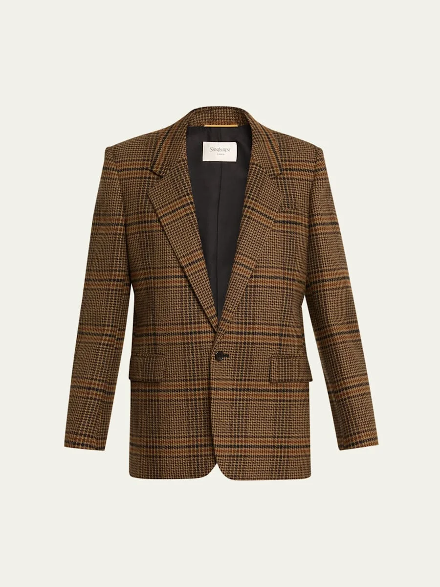 Saint Laurent blazer jacket is crafted of a wool-blend houndstooth check Notch lapels; single-breasted front Long sleeves; button cuffs Padded shoulders Chest welt pocket Hip flap pockets Oversized fit Hem falls below the hip Walking vent back Button closure Wool/silk/cotton Made in Italy Online Inquiries: BGS21_BA8X5| Store Inquiries: #5056003