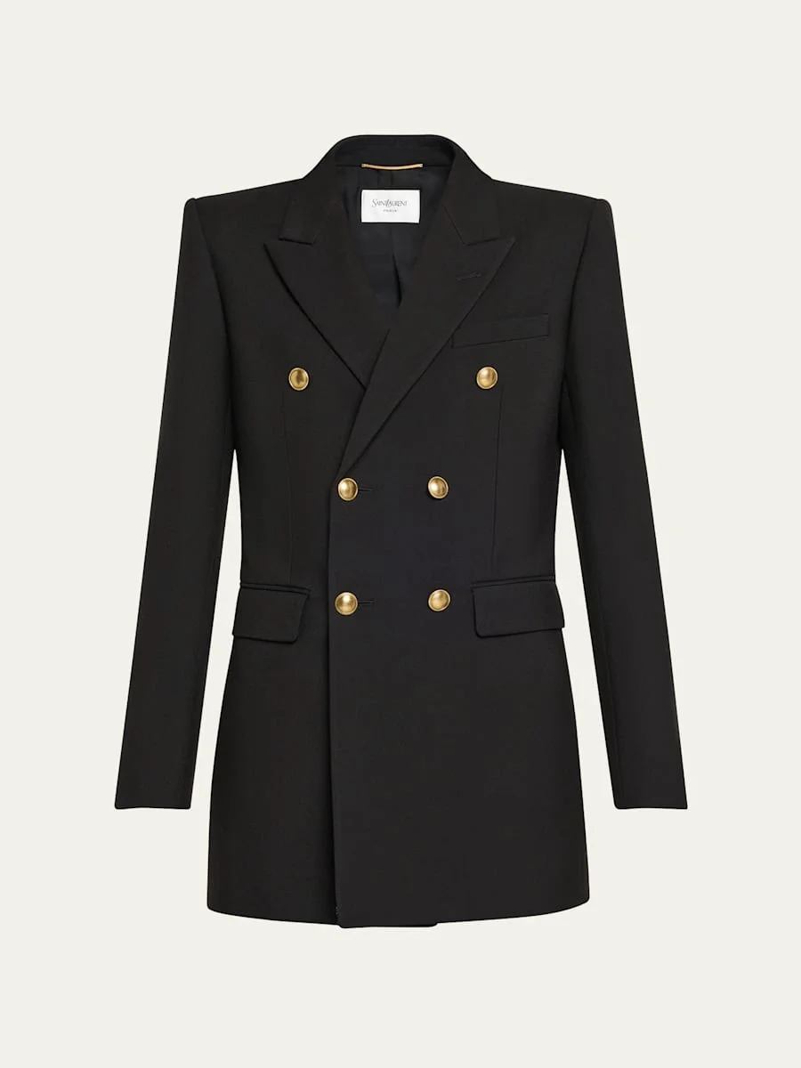 Saint Laurent gabardine blazer with sharp padded shoulders and gold-tone buttons Peak lapels; double-breasted Long sleeves; button cuffs Two jetted flap pockets; welt chest pocket Two inner jetted pockets Oversized fit Single back vent Wool Made in Italy Proposition 65 warning for California residents Online Inquiries: BGS21_B9RVL| Store Inquiries: #4952695