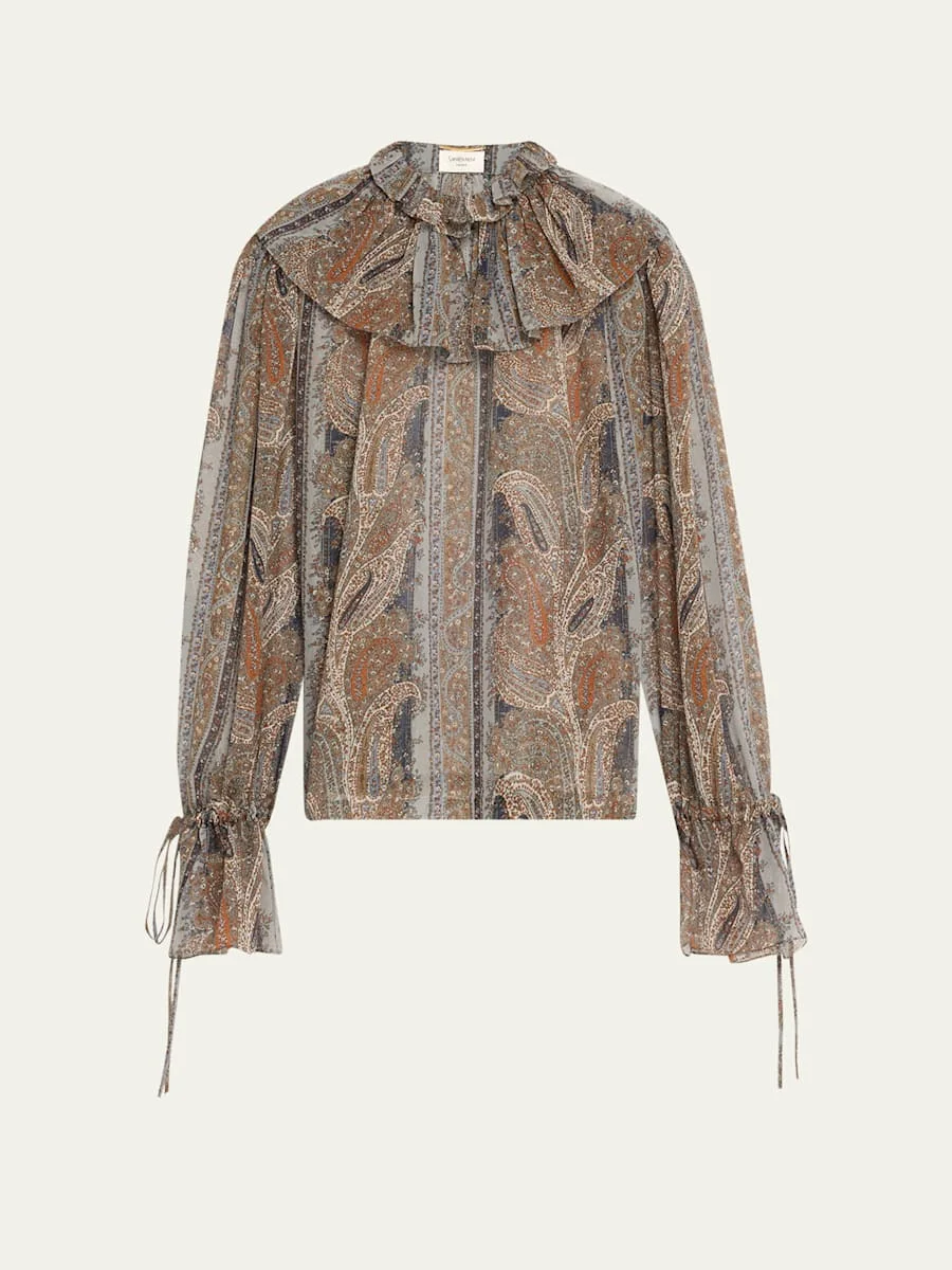Saint Laurent sheer georgette blouse in paisley print Pierrot collar; concealed button placket Long sleeves; drawstring poet cuffs Straight silhouette Silk Made in Italy Proposition 65 warning for California residents Online Inquiries: BGS21_B9PB6| Store Inquiries: #4934499