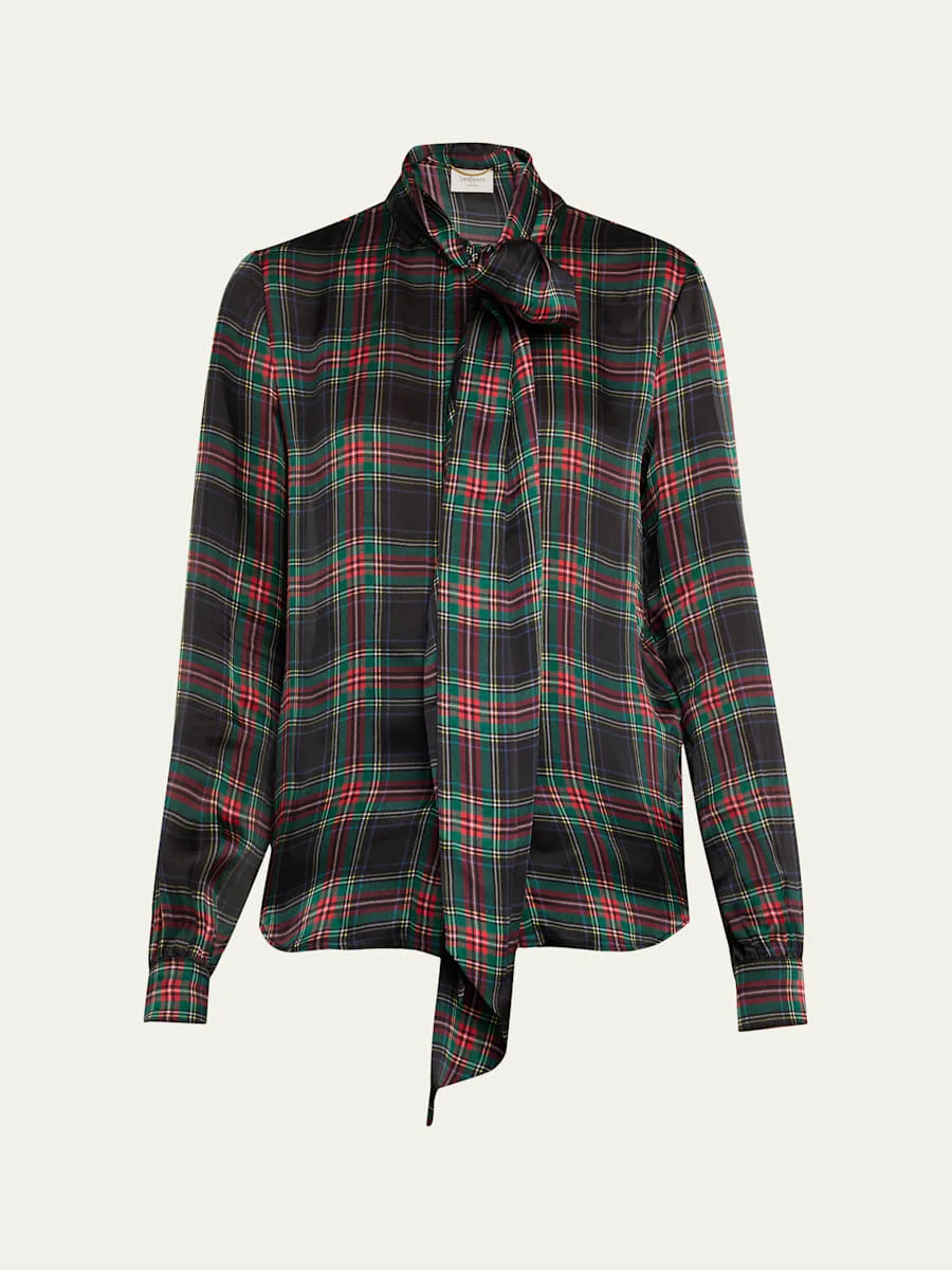 Plaid Tie-Neck Silk Blouse