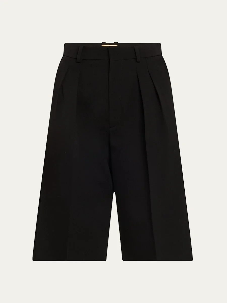Saint Laurent tailored Bermuda shorts with a double-pleated front High rise Side slip pockets; back button-welt pockets Wide legs Knee length Hook/zip fly; belt loops Cotton Made in Albania Proposition 65 warning for California residents Online Inquiries: BGS21_B9Y93| Store Inquiries: #4999628