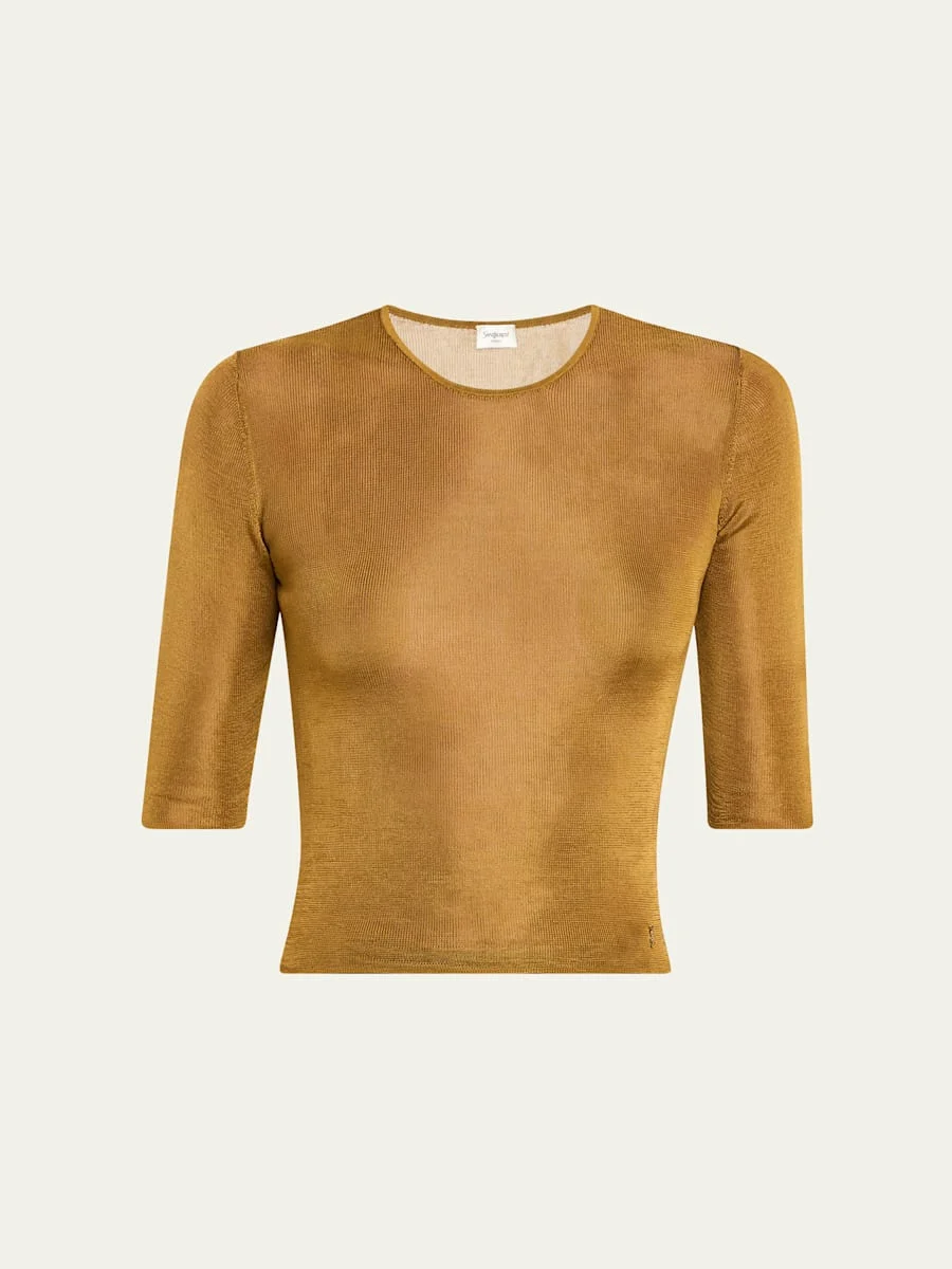 Saint Laurent knit top crafted from lightweight viscose with a subtle logo on the hem Crew neckline Quarter sleeves Fitted silhouette Pullover style Viscose Made in Italy Proposition 65 warning for California residents Online Inquiries: BGS21_B9RVK| Store Inquiries: #4952694