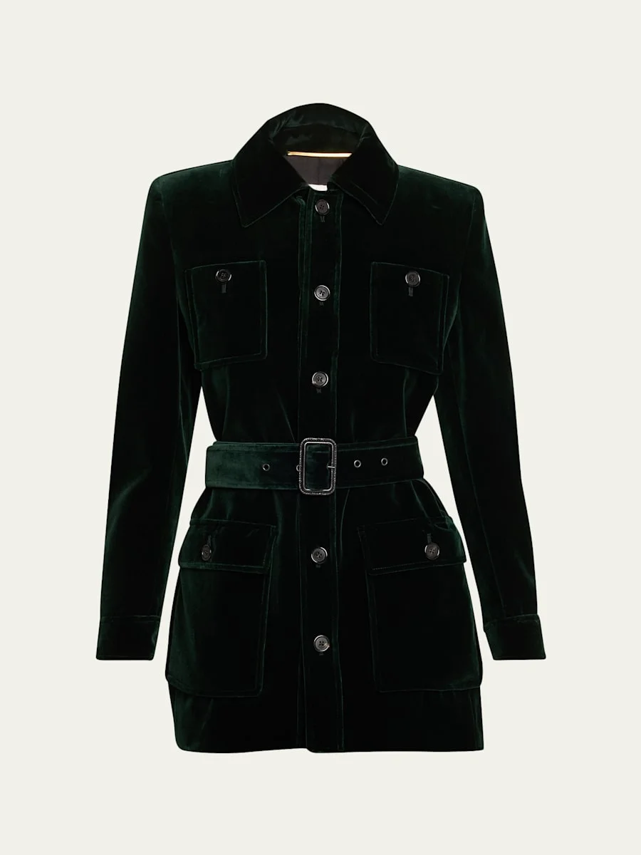 Crafted of certified cotton velvet, this Saint Laurent safari tunic jacket blends elegance with utilitarian style. Point collar Long sleeves with two-button cuffs Four front flap pockets Two inner jetted pockets Adjustable and removable belt Tunic length Button front closure Cotton Silk lining Made in Italy Online Inquiries: BGS21_BA8XG| Store Inquiries: #5056018