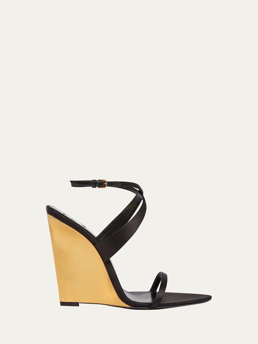 Saint Laurent "Salome" wedge sandals in viscose-silk satin and metallic lamb leather 4.33 in / 110 mm covered wedge heel Pointed open toe Adjustable crossover ankle strap Leather outsole Made in Italy Online Inquiries: BGS21_X6SDB| Store Inquiries: #4933583