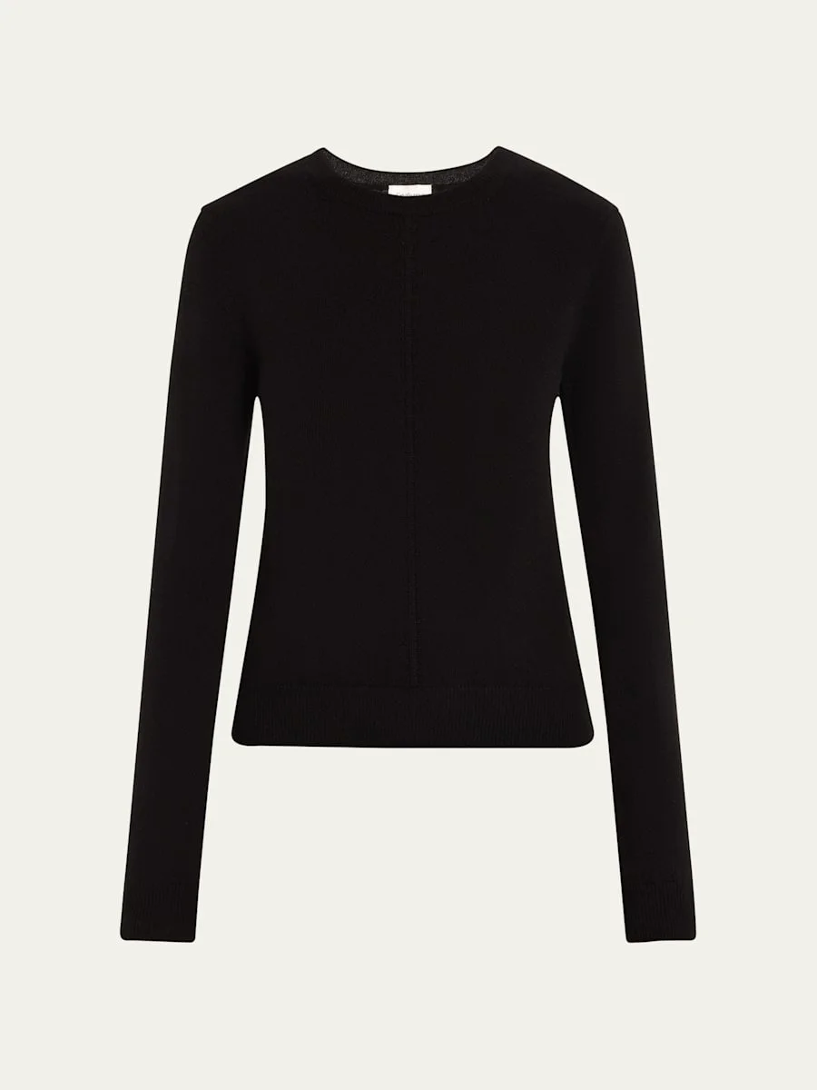 Saint Laurent sweater knitted from cashmere detailed with front and back raised seams Crew neckline Long sleeves Slim fit Ribbed cuffs and hem Pullover style Cashmere Professional cleaning recommended Made in Italy Model is 5'10"/177cm. Online Inquiries: BGS21_B9JN9| Store Inquiries: #4884776