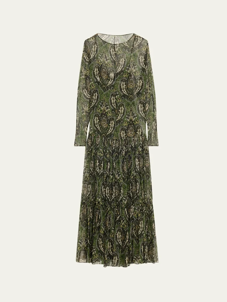 Saint Laurent semi-sheer gown in paisley print with a pleated skirt Slip underpinning Bateau neckline Long sleeves Dropped waist A-line silhouette Falls below the ankles Silk Made in Italy Proposition 65 warning for California residents Online Inquiries: BGS21_B9PAM| Store Inquiries: #4934475