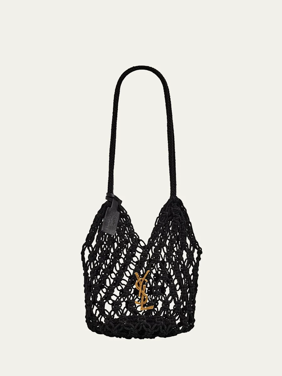 Saint Laurent shopper tote bag crocheted in polyester cord Features signature YSL logo accent Rolled shoulder straps Open top Approx. 11.4"H x 11"W x 3.1"D Made in Italy Online Inquiries: BGS21_V6L0N| Store Inquiries: #5035824