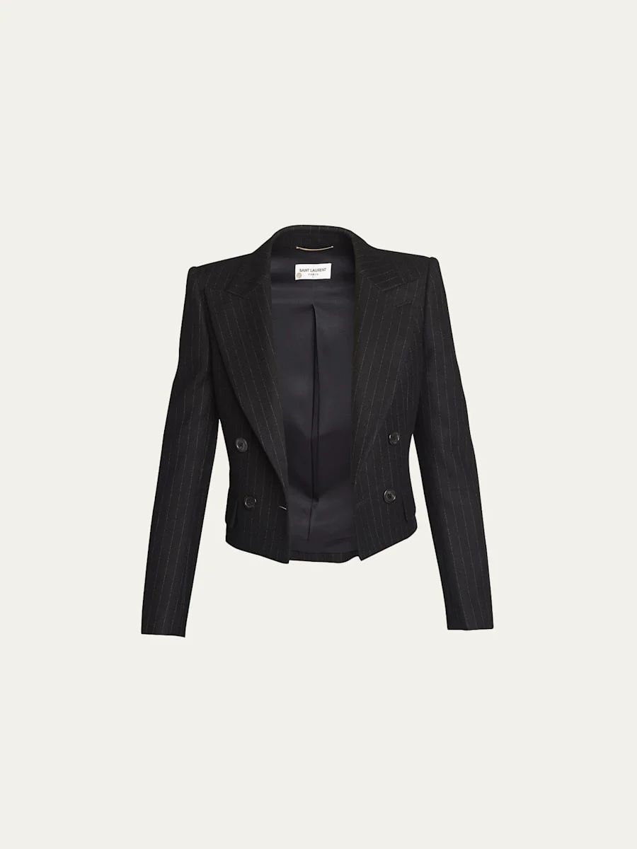 Saint Laurent "Spencer" jacket in pinstripe Peak lapels; double-breast Long sleeves; button cuffs Chest welt pocket; hip flap pockets Boxy fit Cropped length Wool/cotton Made in Italy Model is 5'10"/177cm. Online Inquiries: BGS21_B8P50| Store Inquiries: #4615505