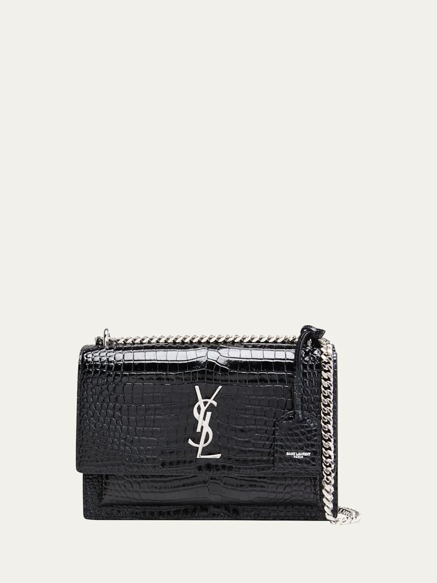 Saint Laurent crocodile-embossed leather crossbody bag. Silvertone hardware. Chain and leather shoulder strap can be doubled, 11"-20.1" drop. Flap top with logo lettering; snap closure. Hanging leather encased key ring. Slip pocket under flap. Back slip pocket. Divided interior; suede lining. 6.2"H x 8.6"W x 3.1"D. Approx. 1.3 lbs/ 0.6kg "Sunset" is made in Italy. Online Inquiries: BGS21_V5JVU| Store Inquiries: #1905338