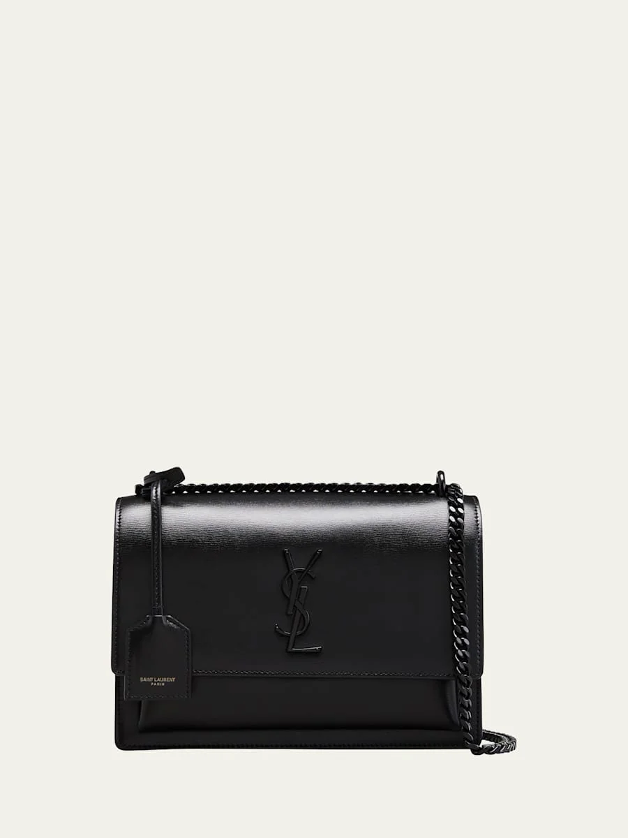 Saint Laurent shoulder bag in calfskin grain leather. Silvertone hardware. Can be worn over the shoulder or across the body. Detachable chain and leather shoulder strap, 11" drop. Flap top with snap closure. Slip pocket under flap. Exterior, logo at center front; hanging logo tag. Interior, dual compartments; one card slot. Bag weighs approx. 2.6 lb./ 1.2 kg. 6.3"H x 8.7"W x 3.1"D. "Sunset" is made in Italy. Online Inquiries: BGS21_V4HGK| Store Inquiries: #3320993