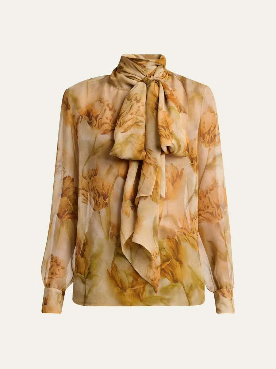 Tie-Neck Floral-Print Silk Chiffon Blouse