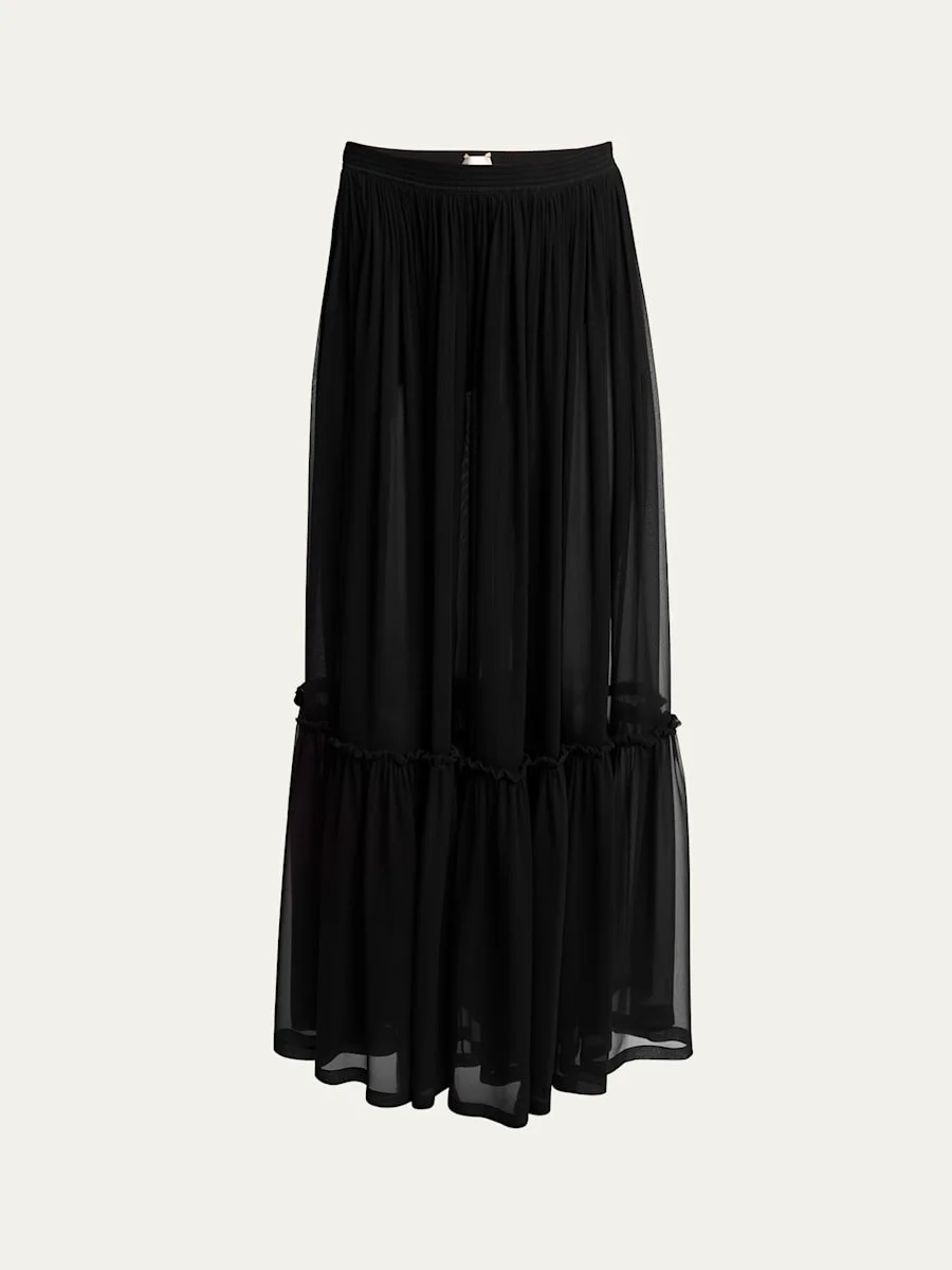 Saint Laurent tiered sheer skirt Elasticized waistband Full length A-line silhouette Pull-on style Silk Made in Italy Proposition 65 warning for California residents Online Inquiries: BGS21_B9RVH| Store Inquiries: #4952691