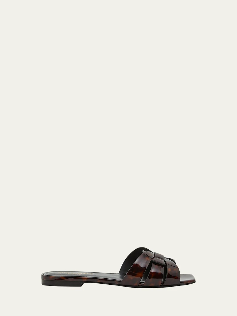 Saint Laurent "Tribute" woven tortoiseshell calf leather sandals 0.17 in / 5 mm flat heel Open toe Caged vamp Slide style Made in Italy