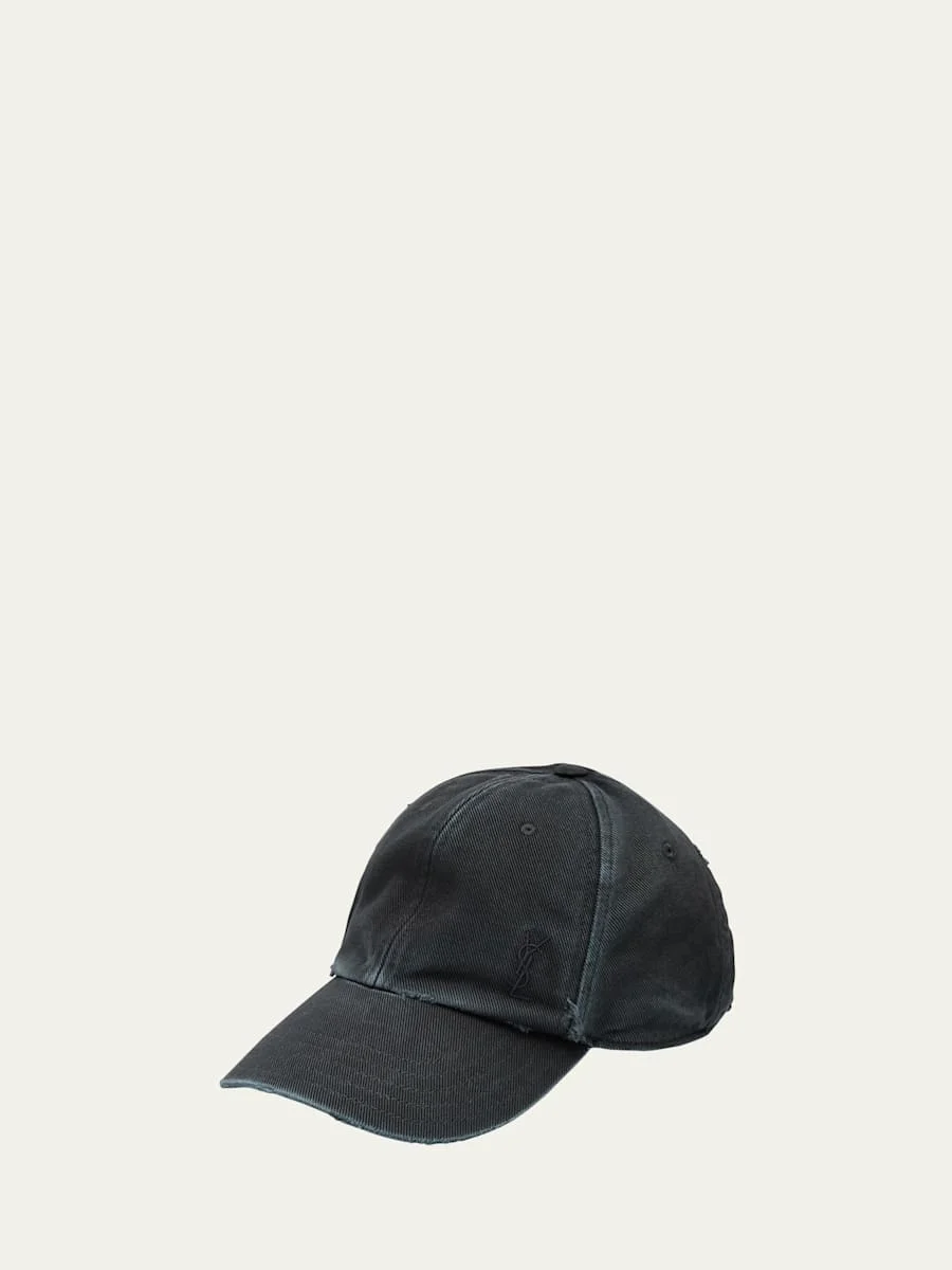 Saint Laurent distressed denim baseball cap in cotton Button top Round, paneled crown Embroidered YSL accent Curved brim Buckle closure Made in Italy Online Inquiries: BGS21_D4UG2| Store Inquiries: #4705310