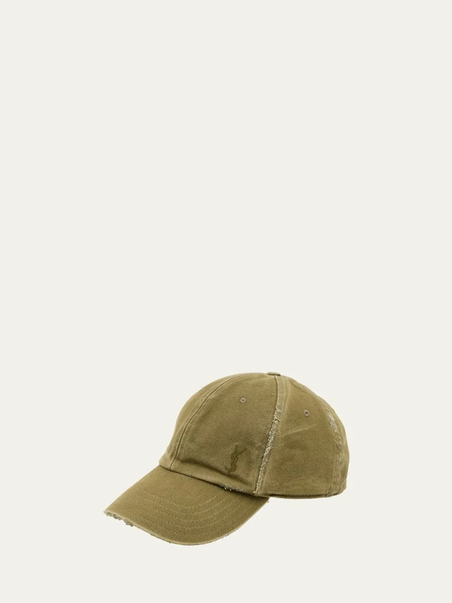 Saint Laurent distressed denim baseball cap in cotton Button top Round, paneled crown Embroidered YSL accent Curved brim Buckle closure Made in Italy Online Inquiries: BGS21_D4UG2| Store Inquiries: #4705310