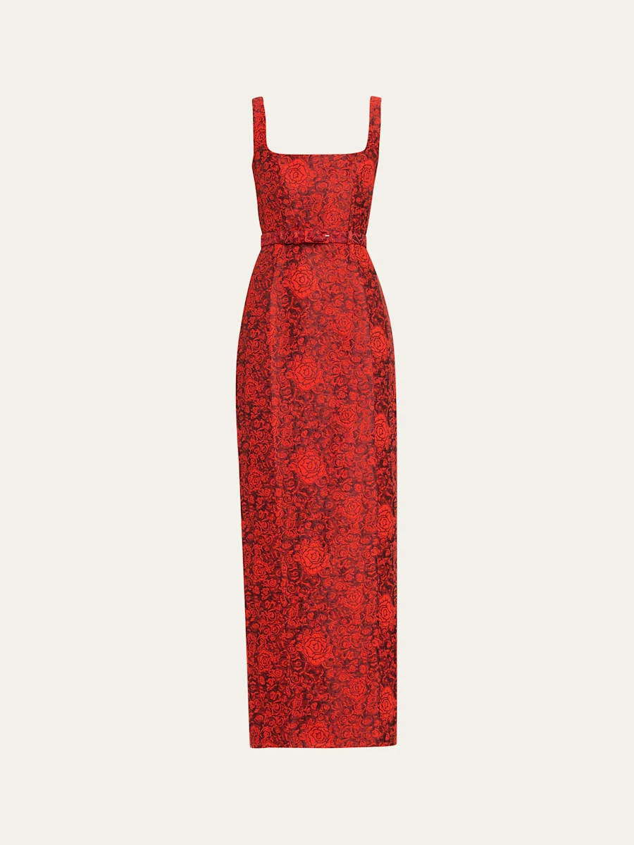 Crafted in rose brocade, the "Bora" dress by Saloni features a chic, structured silhouette and adjustable belt to cinch the waist and hug your curves in all the right places. Square neckline Sleeveless Column silhouette Full length Center back zip Polyester/spandex Dry clean Imported