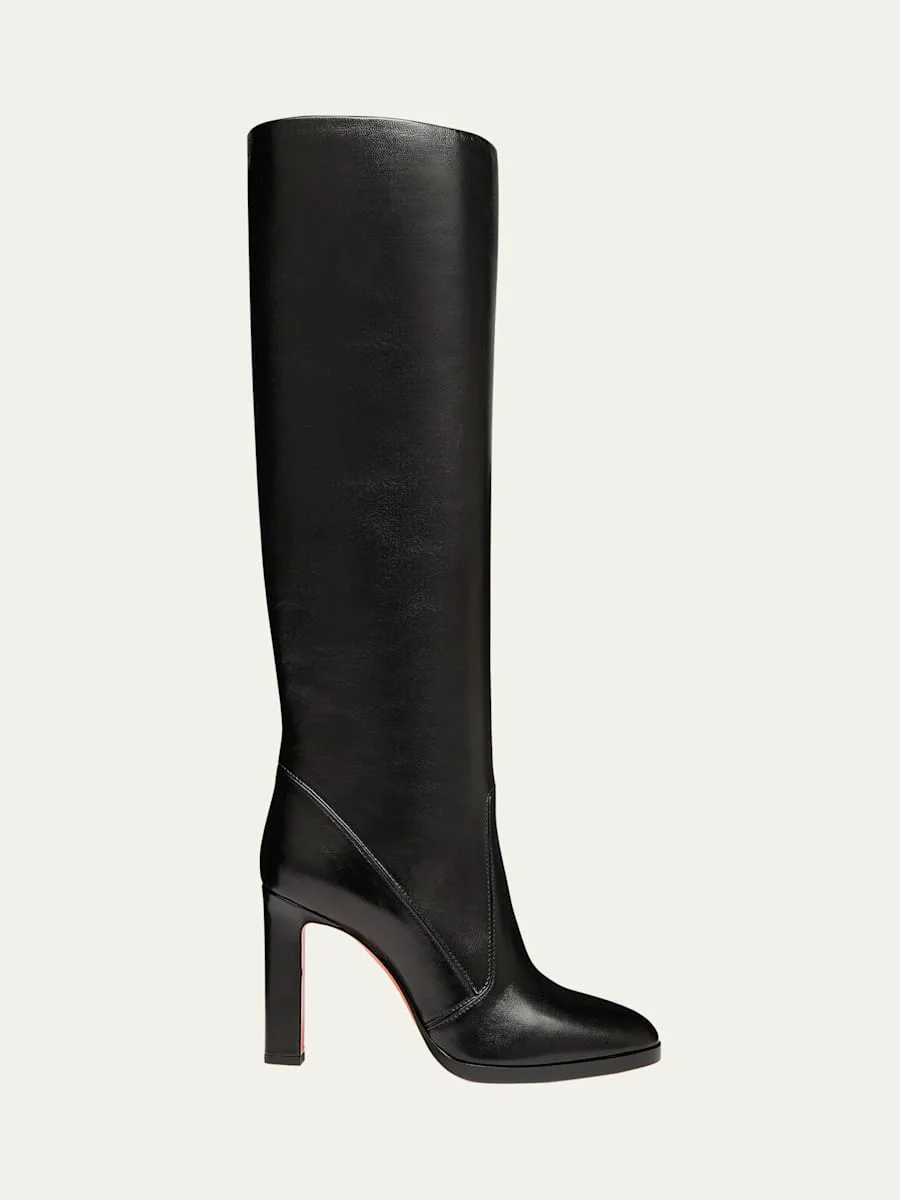 Santoni "Andy" calf leather knee boots 4.00 in / 100 mm thick stiletto heel Almond toe Zip closure for easy on/off Leather outsole Lining: Leather Made in Italy