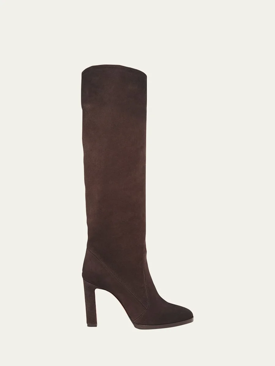 Santoni "Andy" suede knee boots 4.00 in / 100 mm thick stiletto heel Almond toe Zip closure for easy on/off Leather outsole Lining: Leather Made in Italy