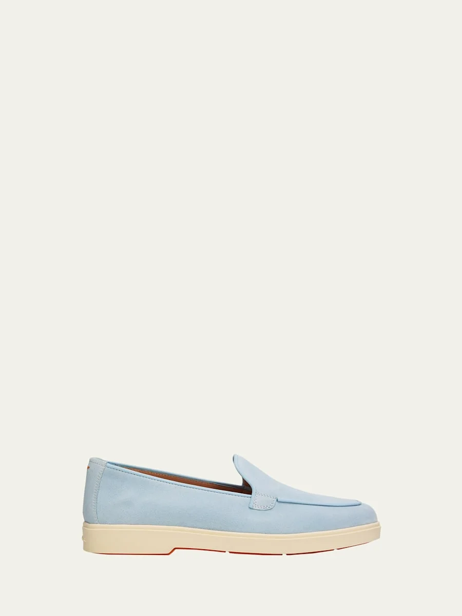 These Santoni loafers are designed in supple suede with tonal smooth leather piping 0.25 in / 10 mm flat heel Almond toe Notched vamp Slipon style Rubber outsole Made in Italy