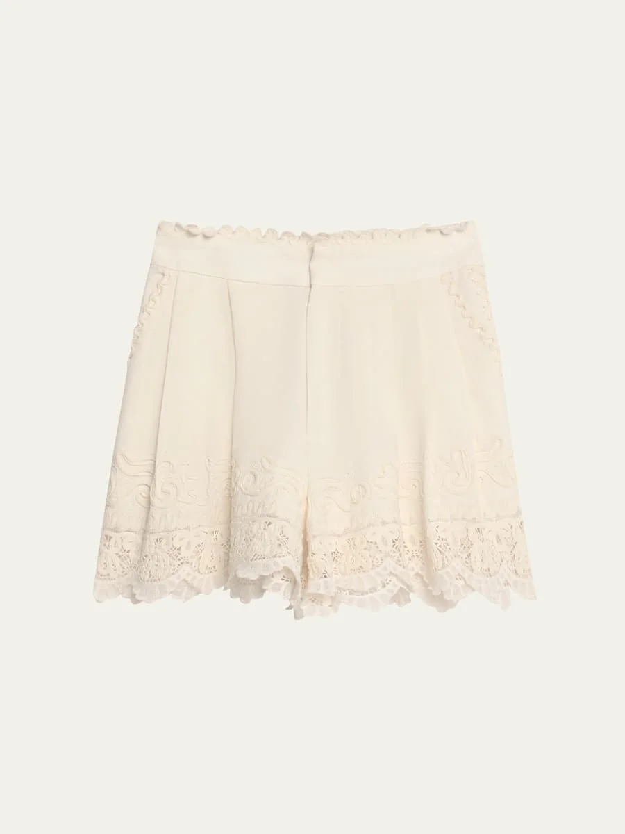 Sea "Iyla" embroidered shorts finished with scalloped lace trim Approx. 3.5" inseam Mid-rise; sits high on the hip Pleated front Side pockets Loose fit Hook/zip fly Cotton/linen/polyester Dry clean Imported Online Inquiries: BGS21_T6TVZ| Store Inquiries: #5034377