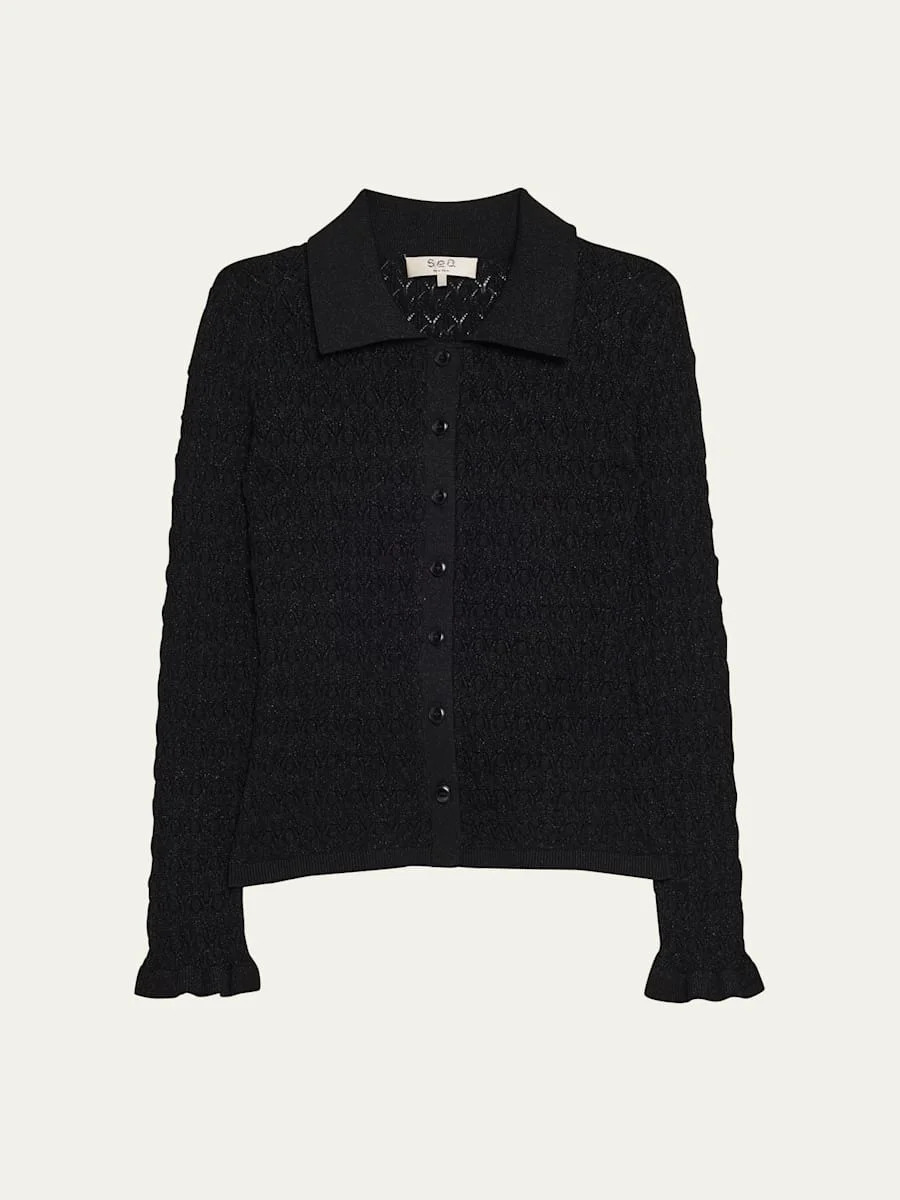 Sea "Ruby" pointelle-knit cardigan Point collar; button-front Long sleeves with flared cuffs; approx. 24"L Fitted Hem sits at the hip Viscose Dry clean Imported Online Inquiries: BGS21_T6YW7| Store Inquiries: #5059495