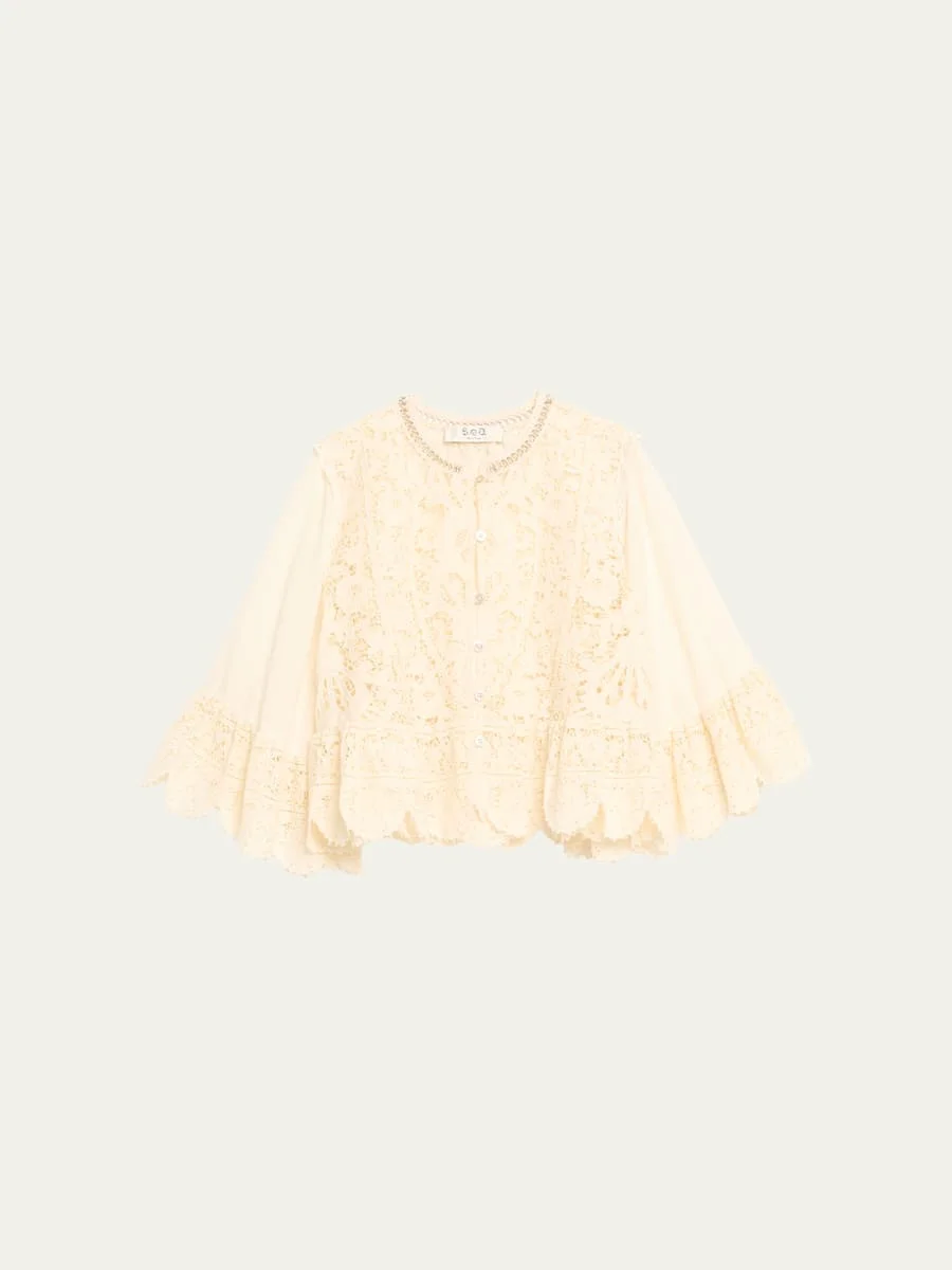 Sea "Shanna" intricate lace-embroidered top finished with scalloped trim High neckline Three-quarter sleeves; approx. 17.3"L Loose fit Hem sits at the hip Button-front Cotton/viscose/polyester Dry clean Imported Online Inquiries: BGS21_T6YWC| Store Inquiries: #5059501