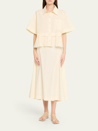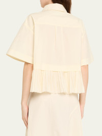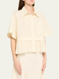 Sea's "Solene" top features a contrasting pleated hem, adding a feminine touch to a classically masculine silhouette Approx. 22.5"L from shoulder to hem Spread collar; button front Relaxed elbowlength sleeves; approx. 9"L Single chest patch pocket Yoked back Relaxed fit Hip length Cotton/ramie Dry clean Imported