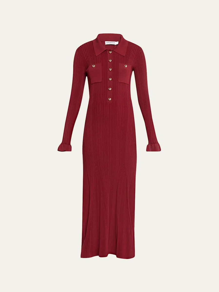 Knit from ribbed fabric for a soft yet sculpted fit, this midi dress from Self-Portrait is finished with golden buttons and flared cuffs Polo collar; partial button front Removable shoulder pads Long sleeves with flared cuffs Chest patch pockets Hem falls below the knee Body-skimming silhouette Slipover style Viscose/polyester/nylon/polyamide Dry clean Imported Online Inquiries: BGS21_T8RWD| Store Inquiries: #5373118