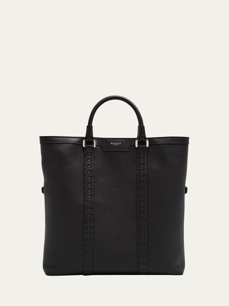 Serapian foldable tote bag in Cachemire leather and Mosaico Cachemire leather is an exclusive naturally tumbled calfskin leather Effortlessly folds in two to allow for easy storage and travel Foiled logo on the front Adjustable detachable leather shoulder strap with snap-hooks Two rolled top handles Can be styled crossbody or carried by hand Magnetic closure Interior, single compartment, two vertical pockets, one large flat pocket Sueded microfiber lining Palladium finish hardware Approx. 15.0"H x 14.2"W x 2.4"D Leather method dry cleaning Made in Italy Online Inquiries: BGS21_NCSZP| Store Inquiries: #4945971