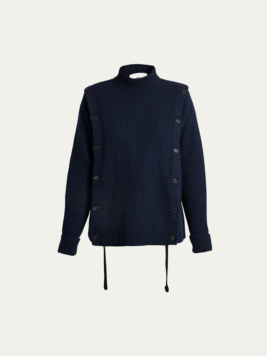 SETCHU rib-knit sweater with side button detail Mock neckline Long sleeves Relaxed fit Button closure Wool/cashmere Made in Italy Model is 5'10"/177cm. Online Inquiries: BGS21_B8PFU| Store Inquiries: #4617351
