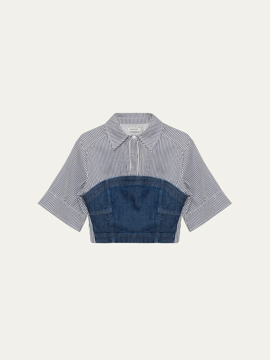 SIMKHAI "Adams" striped combo shirt finished with a paneled denim bodice Point collar Short sleeves with button cuffs Smocked back panel Cropped fit Pullover style Cotton/elastane Dry clean Imported Online Inquiries: BGS21_T6H3Z| Store Inquiries: #4985910