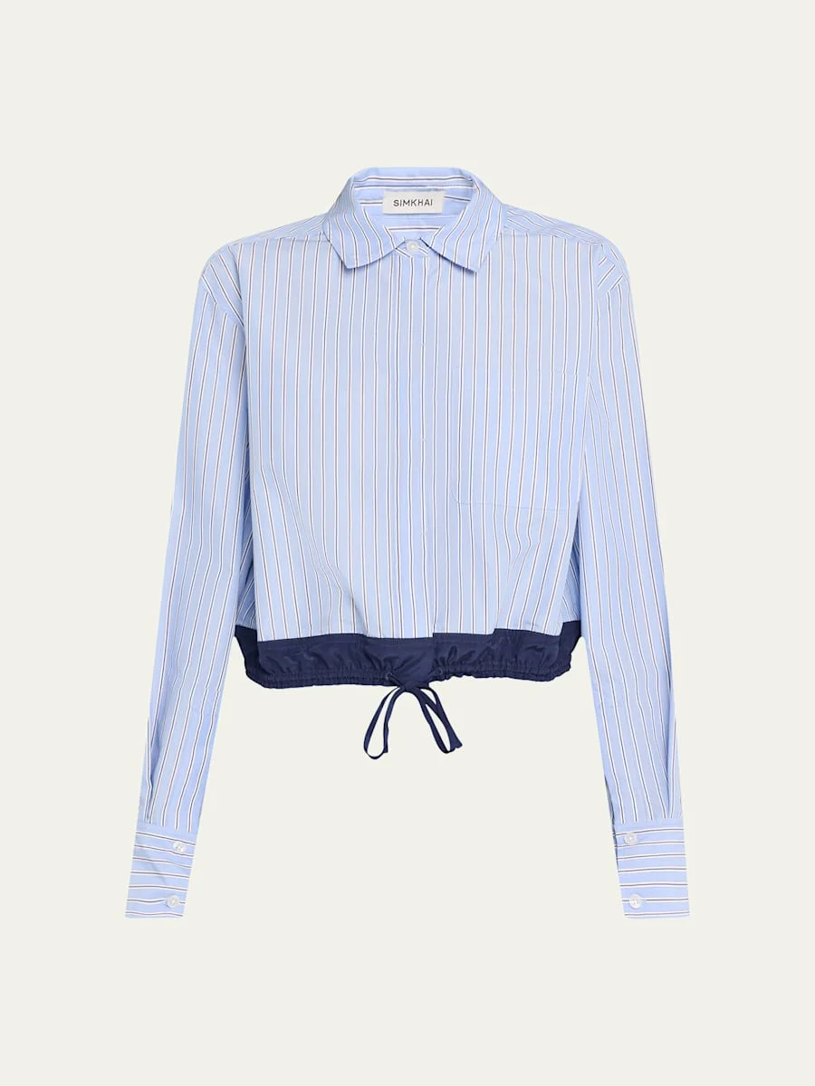 SIMKHAI "Adryck" pinstripe shirt featuring a drawstring hem Point collar Long sleeves with button cuffs Chest pocket Relaxed fit Concealed button-front Polyester/cotton/acetate Dry clean Imported Online Inquiries: BGS21_T69EN| Store Inquiries: #4936812