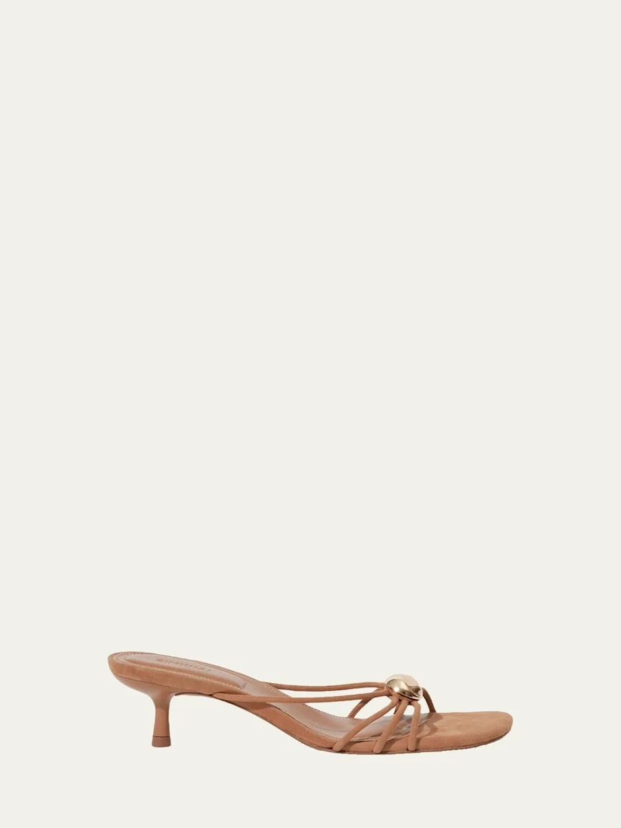 SIMKHAI's "Amaya" mule sandals are crafted from supple suede and finished with a central goldtone dome accent 1.75 in / 45 mm covered kitten heel Squared open toe Strappy caged vamp Easy slide style Leather lining and outsole Wipe clean Made in Brazil
