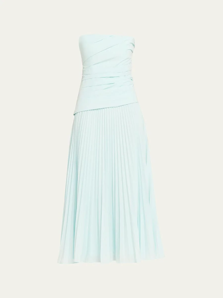 SIMKHAI "Arie" maxi dress adorned with a ruched bodice and pleated skirt Strapless neckline Sleeveless Dropwaist silhouette Full length Side zip Polyester/cotton Dry clean Imported
